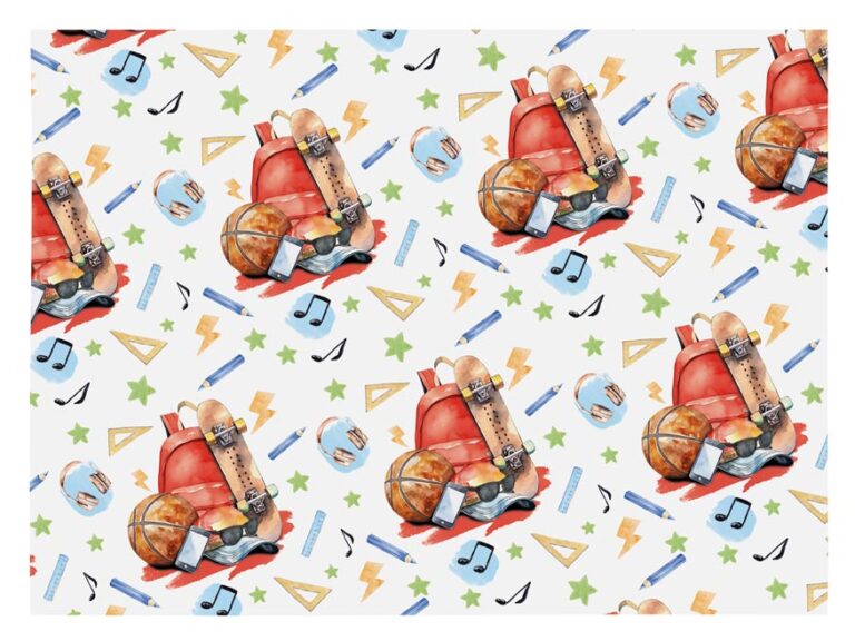 Celoroční balicí papír LUX s hravým motivem batohu, skateboardu, míče, sluchátek a dalších ikon školního života. Ideální pro děti, teenagery i každého, kdo si užívá aktivní den plný pohybu, hudby a zábavy.Vhodný na narozeniny, začátek školy i každodenní radost.