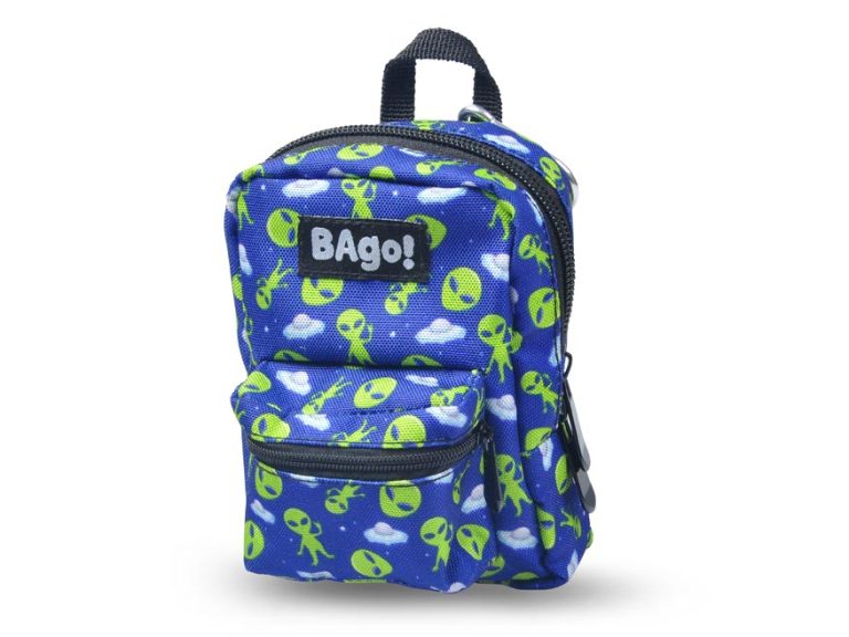 Minibatůžek Bago je v modré barvě, pokrytý vzorem mimozemšťanů a létajících talířů. Disponuje prostornou hlavní kapsou s dvoucestným zipem, která je ideální pro uložení drobných nezbytností. Přední kapsička se zipem nabízí další úložný prostor na malé předměty, jako jsou peníze nebo klíče. Na zadní straně jsou dvě černé gumičky, které imitují ramenní popruhy a umožňují tak snadné upevnění na řidítka kola či koloběžky, nebo jednoduše na zápěstí. Batůžek je vybaven stříbrnou karabinou, díky které ho připevníte ke kalhotám, batohu nebo tašce, a může posloužit také k zavěšení klíčů či přívěsku. Tento stylový batůžek zaujme nejen svým vzhledem, ale i praktičností.