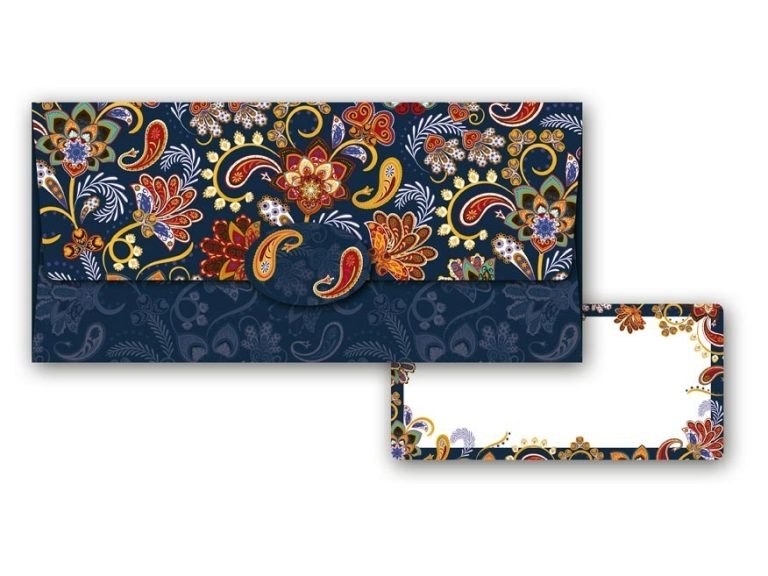 I finanční dar si zaslouží hezkou formu předání. Obálka na peníze s bohatým ornamentálním vzorem v kombinaci tmavě modré, zlaté, červené a krémové barvy zaujme propracovaným zdobením a výraznými dekorativními detaily.