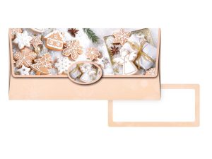 Dárková obálka na peníze s vánočním motivem perníčků a uzavíratelnou klopou. Je ideální pro dárkové účely, kdy chcete peníze předat elegantním a vkusným způsobem. Uvnitř je kartička bez textu, na kterou můžete napsat věnování.