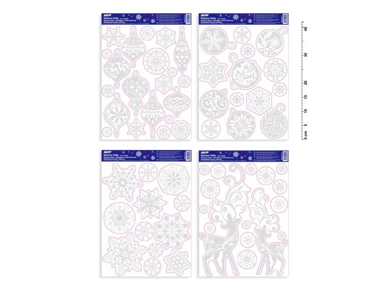 Vánoční okenní folie s vánočními motivy. Pomocí okenních fólií si velmi snadno a rychle vytvoříte vánoční atmosféru na celé svátky. Fólie neobsahuje lepidlo, jednoduše elektrostaticky přilne na čistém okně, zrcadle apod.