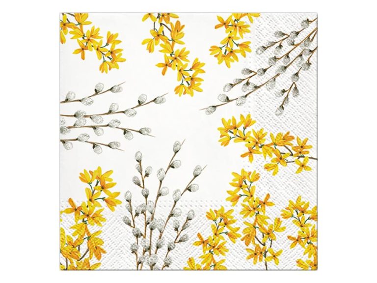 Papírový velikonoční ubrousek. Ubrousky s rozkvetlými větvičkami kočiček a zlatého deště vnesou jaro na váš stůl. Ubrousek je velice kvalitní z třívrstvého papíru. Vhodný i na ubrouskovou techniku.