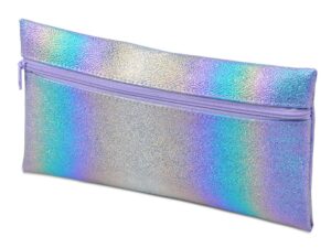 Školní penál/etue s výrazným duhovým povrchem, který vytváří holografický efekt s různými barevnými přechody. Zip, který se táhne po celé šířce penálu, je sladěn s fialovými tóny povrchu. Penál má plochý, obdélníkový tvar, díky čemuž je praktický pro uložení psacích potřeb, drobností nebo kosmetiky.