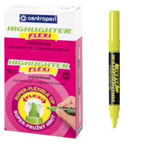 10/ velkokapacitní zvýrazňovač se super pružným hrotem, pro hladké a pohodlné zvýraznění textu na všech druzích papírů, fluorescenční pigmentový inkoust, odolnost proti UV záření, klínový hrot, šířka stopy 1 – 5 mm