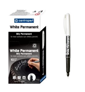 10/ univerzální bílý značkovač, píše na většinu povrchů, po zaschnutí odolá za sucha otěru, na porézních površích permanentní, světlostálý, vodní báze, válcový hrot, šířka stopy 1,2 mm