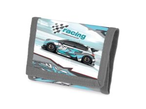 Dětská textilní peněženka s obrázkem závodního auta. Peněženka má přihrádku na bankovky, mince, kapsičku vhodnou například na jízdenky a také kapsičku s průhledným okýnkem o velikosti kreditní karty.