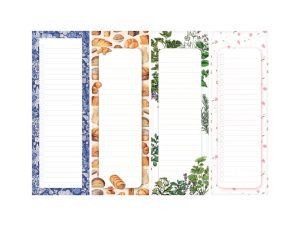 Bloček je dostupný ve čtyřech různých motivech – květiny, bylinky, pečivo nebo klasický modrobílý vzor – takže si snadno vyberete ten, který vám bude nejvíc ladit s prostředím. Linkované listy s jemným dekorativním okrajem zajišťují přehlednost v každé situaci.