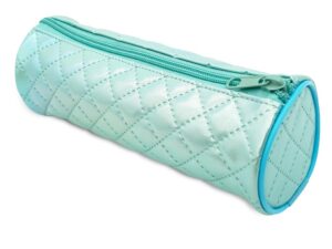 školní penál/etue válcového tvaru v jemné mátově zelené barvě. Lesklý povrch a prošívaný vzor ve tvaru kosočtverců mu dodává texturovaný a elegantní vzhled. Penál má zip v odpovídající mátové barvě, který ladí s celkovým designem. Je ideální pro každodenní používání, ať už na uschování tužek, per, nebo jiných školních potřeb.