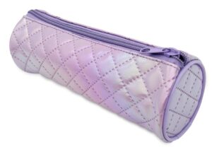 Školní penál/etue válcového tvaru v jemné fialové barvě má lesklý, perleťový povrch, který odráží světlo a mění odstíny podle úhlu pohledu. Povrch je ozdoben prošívaným vzorem ve tvaru kosočtverců. Zip a okraje penálu jsou také laděny do fialové barvy, čímž se celý design krásně sjednocuje. Je ideální pro uložení psacích potřeb, jako jsou tužky, pera či pastelky, a díky svému lesklému povrchu působí luxusním dojmem.