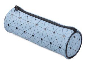 Školní penál/etue válcového tvaru je ve světle modré barvě. Na povrchu je vzor tvořený černými čarami, které se vzájemně kříží a vytvářejí geometrický motiv podobný síti nebo pavučině. V místě, kde se čáry protínají, jsou malé černé body. Penál disponuje jednou hlavní kapsou uzavíratelnou zipem, který je černé barvy, stejně jako okraje penálu. Je vhodný pro uschování a organizaci psacích potřeb, jako jsou tužky, pera, gumy, ořezávátka nebo malé pravítko. Tento design je moderní a stylový, ideální pro každodenní použití ve škole nebo v kanceláři.