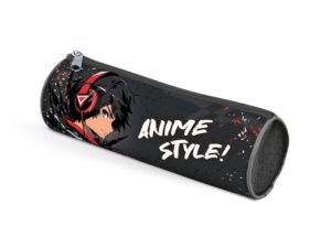 Školní penál/etue válcového tvaru je převážně černé barvy s motivem anime postavy a bílým nápisem "ANIME STYLE!". Penál disponuje jednou hlavní kapsou uzavíratelnou zipem a je ideální pro milovníky anime, kteří chtějí mít své psací potřeby nebo jiné drobnosti uspořádané ve stylovém a osobitém pouzdru. Je vhodný jak do školy, tak na cesty nebo do práce, a díky svému jedinečnému vzhledu bude určitě přitahovat pozornost.