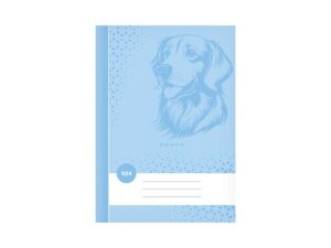 Školní sešit s linkou ve formátu A5, v modré barvě, s motivem psa, v deskách z křídového papíru. Stránky jsou opatřeny okraji o šířce 1,5 cm.