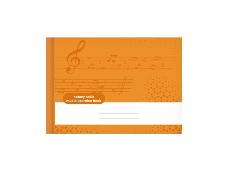 Školní notový sešit ve formátu A5 na šířku, v oranžové barvě, v deskách z křídového papíru. Sešit je určený do hudební výchovy pro zápis not.