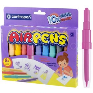 12/ foukací fixy na papír, zdravotně nezávadný inkoust, snadno smyvatelné a vypratelné, 10 barevných odstínů, 4 šablony