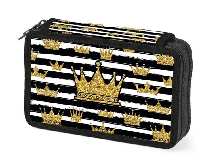 Školní dvoupatrový nevybavený penál v černobílé barvě s motivem zlatých korunek. Penál obsahuje 24 poutek na psací potřeby a 3 větší např. na pravítko, ořezávátko, gumu nebo nůžky. Uzavírá se pomocí zipu a je z kvalitních a odolných materiálů. Bezesporu je nezbytnou součástí vybavení každého školáka.