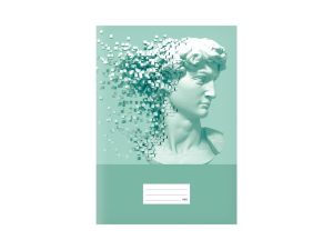 Obálka školního sešitu LUX zobrazuje bustu sochy Davida, která se originálně rozpadá na drobné kostky, čímž propojuje klasickou eleganci s moderním designem.