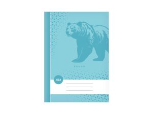 Školní sešit s linkou ve formátu A5, ve tyrkysové barvě, s motivem medvěda, v deskách z křídového papíru. Stránky jsou bez okrajů.