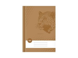 Školní sešit s linkou ve formátu A5, v hnědé, s motivem leoparda, v deskách z křídového papíru. Stránky jsou bez okrajů.