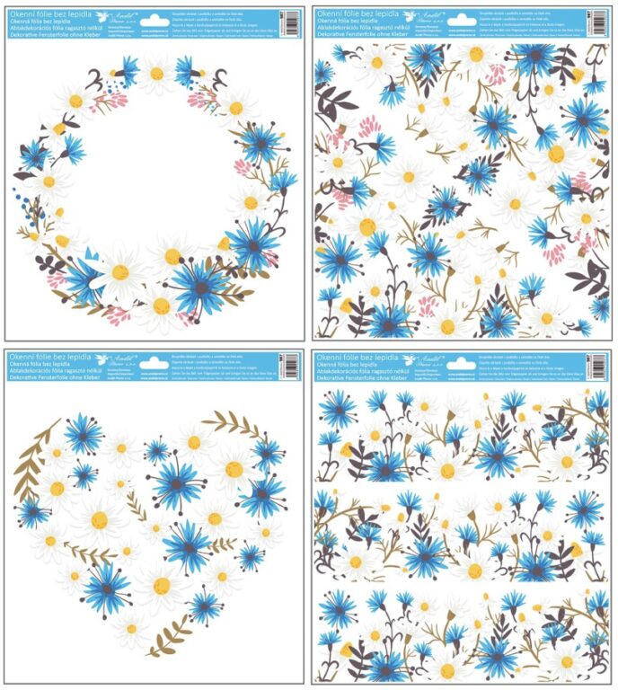 Dekorační, okenní fólie s glitry kytky. Okenní fólie neobsahují lepidlo. Na plochu přilnou elektrostaticky