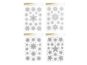 Vánoční okenní fólie glitrová s motivy stříbrných hvězd a vloček. Pomocí okenních fólií si velmi snadno a rychle vytvoříte vánoční atmosféru na celé svátky. Fólie se lehce odlepují a nalepují a nezanechávají za sebou žádné stopy lepidla.