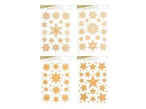 Vánoční okenní fólie glitrová s motivy zlatých hvězd a vloček. Pomocí okenních fólií si velmi snadno a rychle vytvoříte vánoční atmosféru na celé svátky. Fólie se lehce odlepují a nalepují a nezanechávají za sebou žádné stopy lepidla.