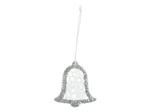 Vánoční dřevěná dekorace zvonek v bílé barvě s glitterm a závěsem. Tato vánoční ozdoba je vyřezaná z překližky. V horní části je očko s provázkem, které umožňuje snadné zavěšení. Můžete použít na ozdobení vánočního stromečku, zavěsit na dveře, okno, nebo jinak zkrášlit Vaše bydlení.
