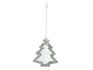 Vánoční dřevěná dekorace vánoční stromeček v bílé barvě s glitterm a závěsem. Tato vánoční ozdoba je vyřezaná z překližky. V horní části je očko s provázkem, které umožňuje snadné zavěšení. Můžete použít na ozdobení vánočního stromečku, zavěsit na dveře, okno, nebo jinak zkrášlit Vaše bydlení.