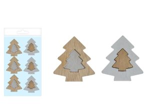 Dřevěná vánoční dekorace ve tvaru vánočního stromečku. Uprostřed stromečku je vyobrazení Ježíška v kolíbce.