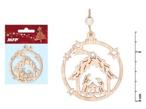Vánoční dekorace baňka dřevěná s vyřezaným betlémem. Vánoční ozdoba je opatřena korálkem a provázkem na zavěšení. Můžete ji použít na ozdobení vánočního stromečku, zavěsit na dveře, okno, nebo jinak zkrášlit Vaše bydlení. Vyrobeno z překližky a přírodních materiálů.