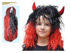 Čertovská paruka s rohy a dlouhými červenými vlasy. Na vnitřní straně paruky je prodyšná síťka, díky tomu se Vám nebude potit v masce hlava. Okraj paruky je opatřený gumičkou, aby maska dobře přilnula a nepadala.