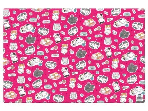 Psací podložka na stůl v růžové barvě s motivem koček. Slouží jako podklad pod kreslení, modelování a jiné tvůrčí činnosti. Chrání nábytek proti poškození a je praktickým pomocníkem školáka. Podložka je vyrobena z papíru, který je zatavený v pevném plastovém obalu.