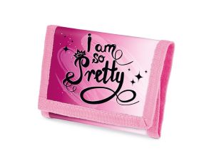 Dětská růžová textilní peněženka s textem "I am so Pretty". Peněženka má přihrádku na bankovky, mince, kapsičku vhodnou například na jízdenky a také kapsičku s průhledným okýnkem o velikosti kreditní karty.