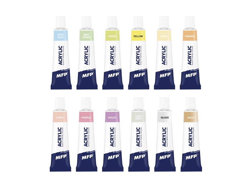 – 12 ks barev ( 10 x pastelová a 2 x metalická) – světle modrá, žlutá, oranžová, růžová, zelená (mint), světle zelená, béžová, fialová, korálová, světle šedá, zlatá, stříbrná.
