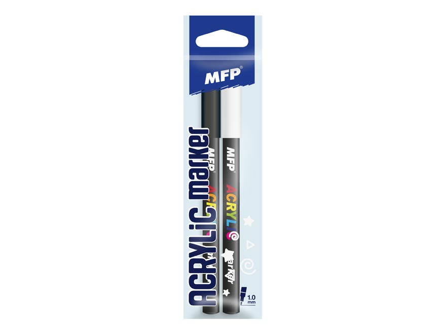 Akrylový popisovač. Sada 2 ks akrylových popisovačů s hrotem 1 mm. Souprava obsahuje bílou a černou barvu. Tyto akrylové popisovače se vyznačují svou barevnou sytostí i stálostí, a velmi dobrými krycími schopnostmi. Jsou vhodné na všechny nemastné a hladké povrchy, jako jsou plátna, papír, dřevo, kámen atd.