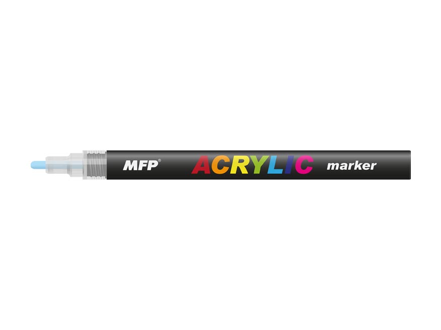 Akrylový světle modrý popisovač. Tyto akrylové popisovače se vyznačují svou barevnou sytostí i stálostí, a velmi dobrými krycími schopnostmi. Jsou vhodné na všechny nemastné a hladké povrchy, jako jsou plátna, papír, dřevo, kámen atd.