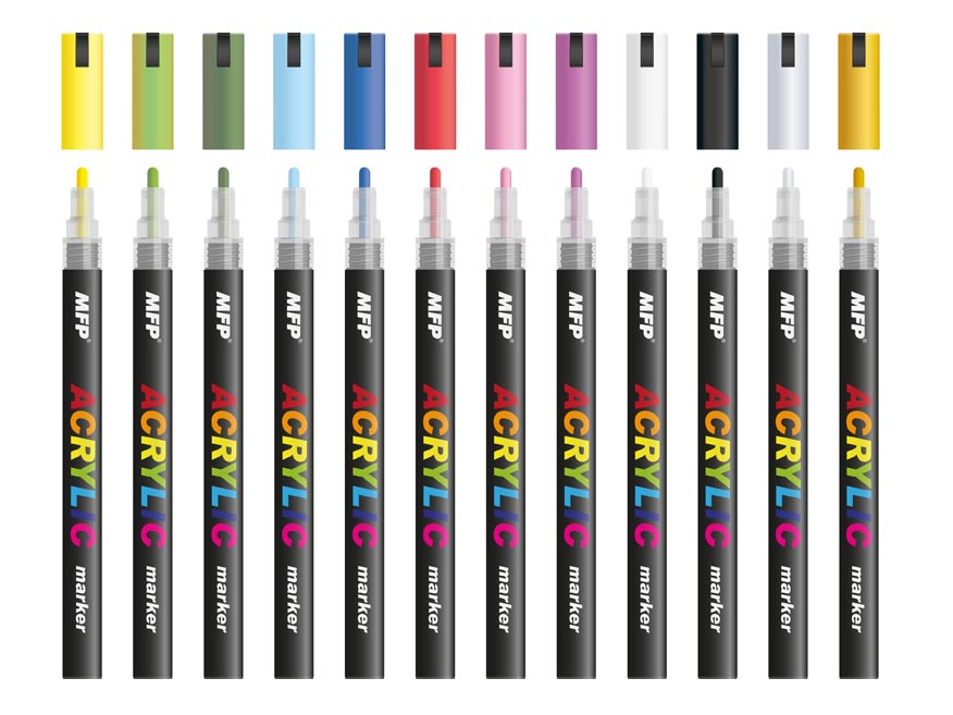 Akrylový popisovač, sada 12 ks balených v plastové krabičce. Tyto akrylové popisovače se vyznačují svou barevnou sytostí i stálostí, a velmi dobrými krycími schopnostmi. Jsou vhodné na všechny nemastné a hladké povrchy, jako jsou plátna, papír, dřevo, kámen atd.