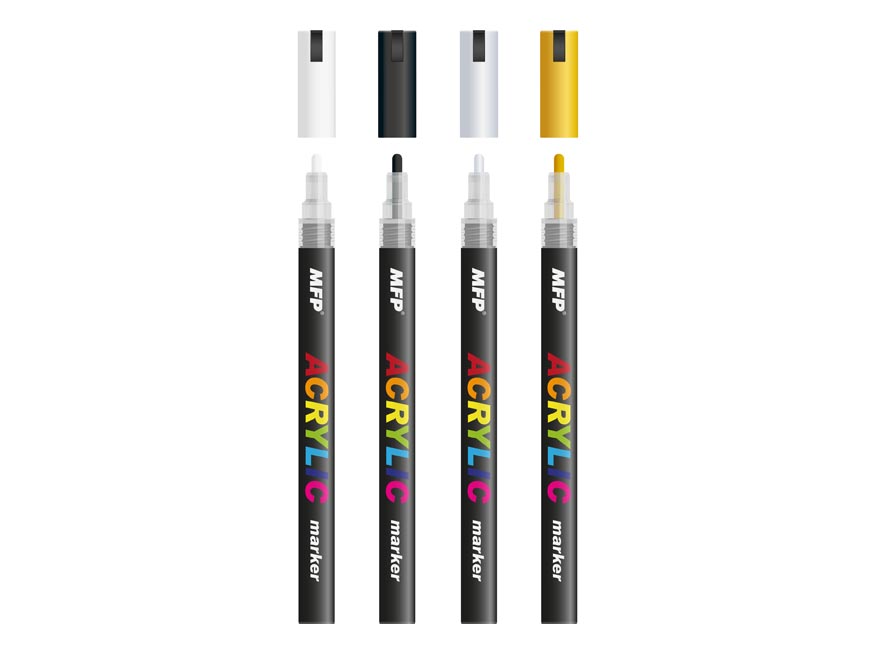 Akrylový popisovač, sada 4 ks balených v plastové krabičce. Tyto akrylové popisovače se vyznačují svou barevnou sytostí i stálostí, a velmi dobrými krycími schopnostmi. Jsou vhodné na všechny nemastné a hladké povrchy, jako jsou plátna, papír, dřevo, kámen atd.