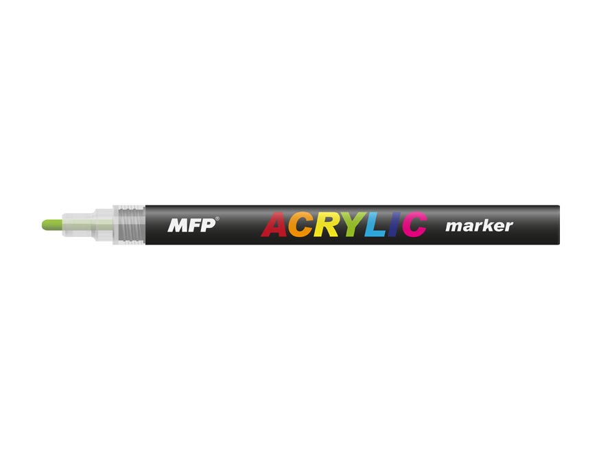Akrylový světle zelený popisovač. Tyto akrylové popisovače se vyznačují svou barevnou sytostí i stálostí, a velmi dobrými krycími schopnostmi. Jsou vhodné na všechny nemastné a hladké povrchy, jako jsou plátna, papír, dřevo, kámen atd.
