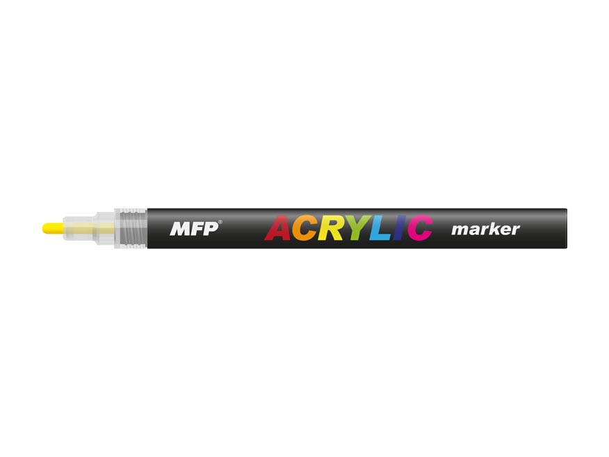 Akrylový žlutý popisovač. Tyto akrylové popisovače se vyznačují svou barevnou sytostí i stálostí, a velmi dobrými krycími schopnostmi. Jsou vhodné na všechny nemastné a hladké povrchy, jako jsou plátna, papír, dřevo, kámen atd.
