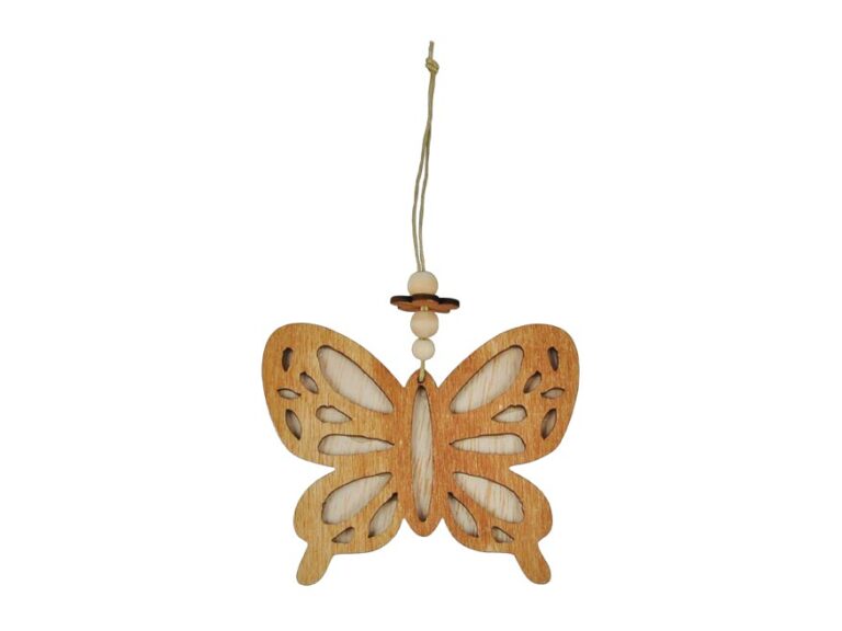 Krásná velikonoční dekorace v designu dřevěného motýla v přírodních barvách se závěsem, poslouží jako