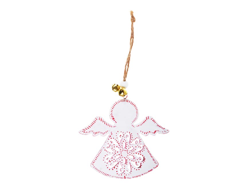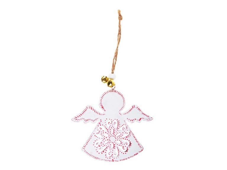 Vánoční plechová dekorace anděl v bílé barvě s červeným ornamentem a závěsem. Tato vánoční ozdoba je opatřena korálkem, rolničkami, očkem a provázkem na zavěšení. Můžete použít na ozdobení vánočního stromečku, zavěsit na dveře, okno a zkrášlit tak Vaše bydlení.
