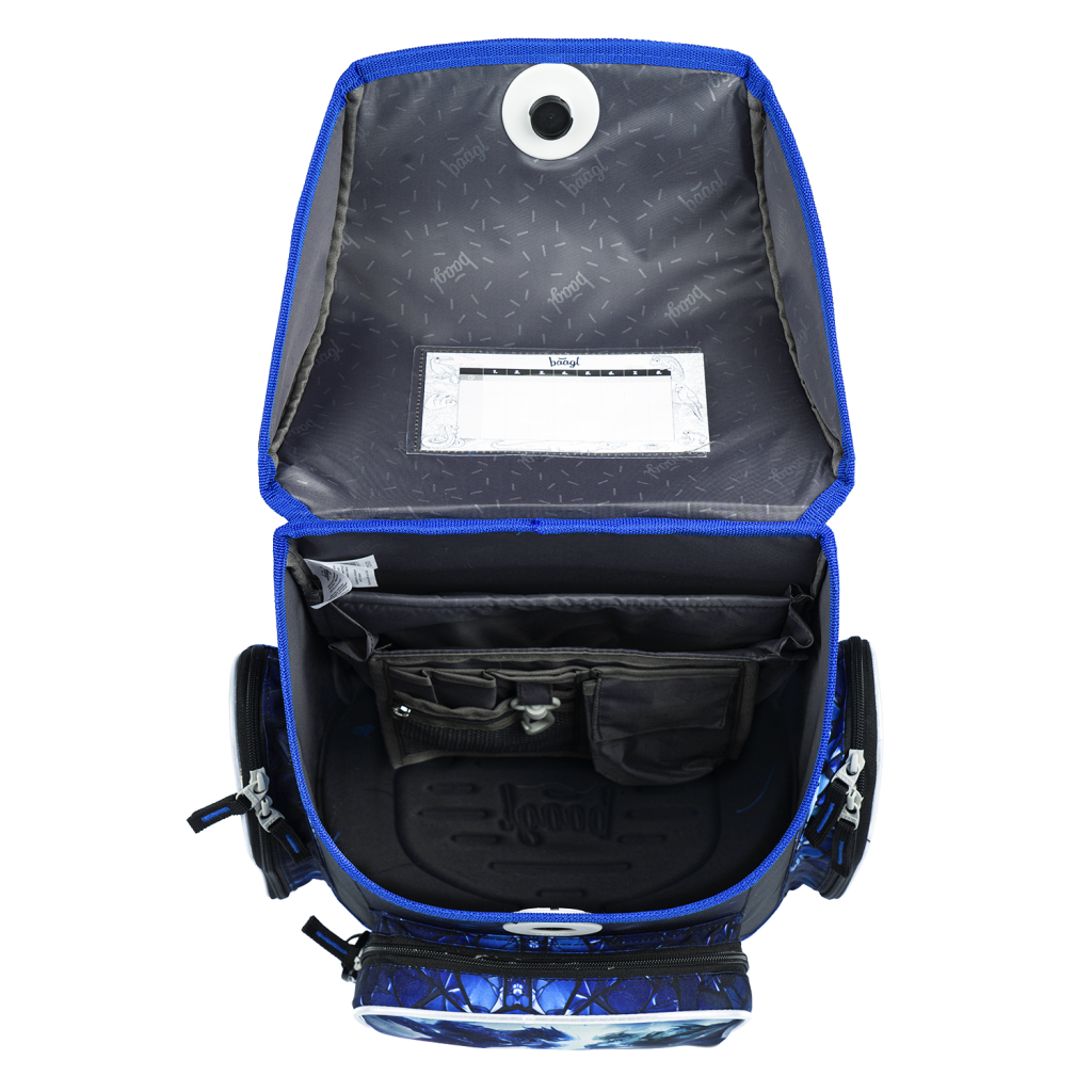 • Uvnitř aktovky je průhledná kapsa s rozvrhem a vnitřní organizér umožňující rovnoměrné rozložení hmotnosti.