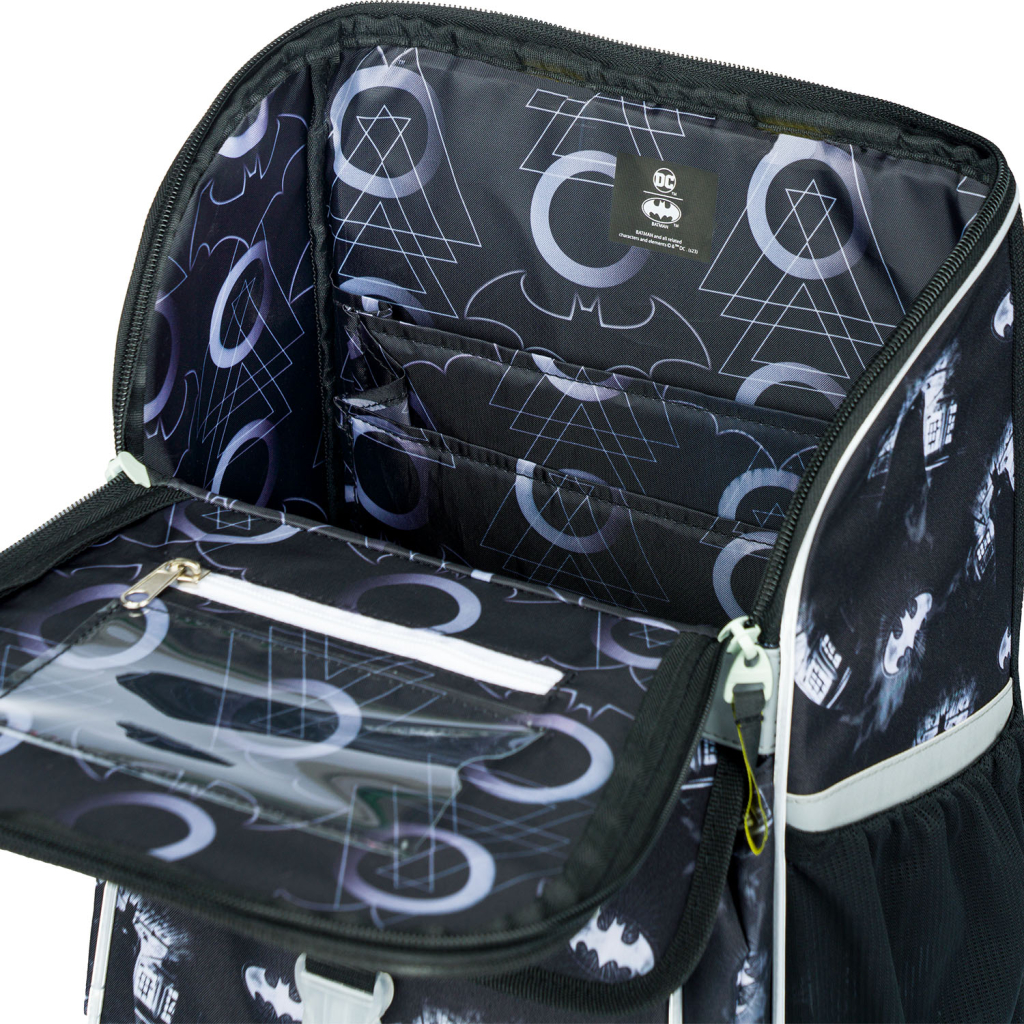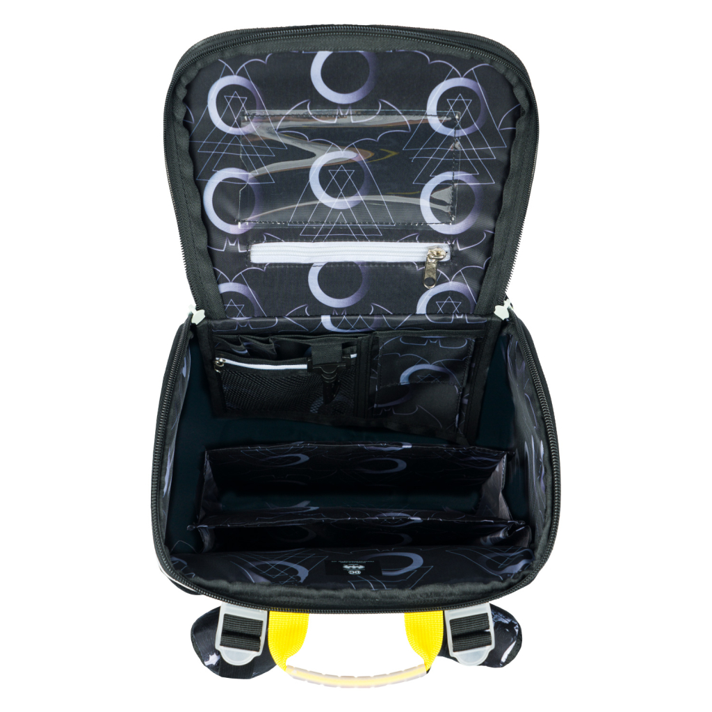 • Uvnitř aktovky je průhledná kapsa na rozvrh a vnitřní organizér umožňující rovnoměrné rozložení hmotnosti, doplněný gumičkou pro fixaci.