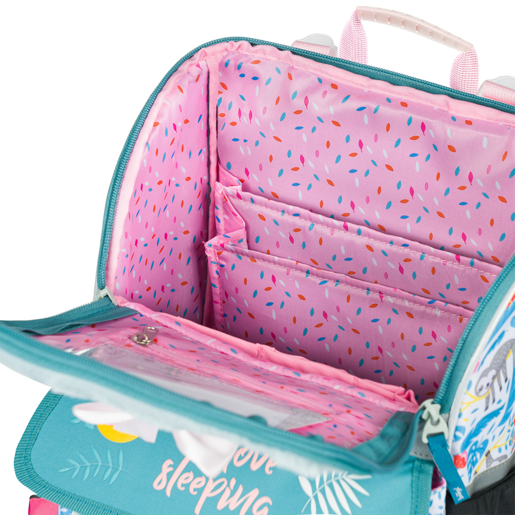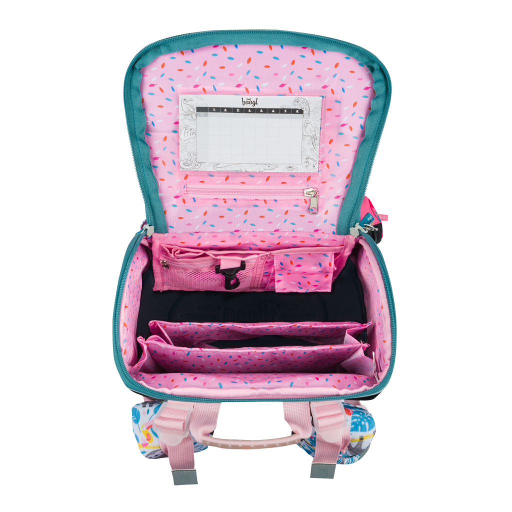 • Uvnitř aktovky je průhledná kapsa s rozvrhem a vnitřní organizér umožňující rovnoměrné rozložení hmotnosti, doplněný gumičkou pro fixaci.