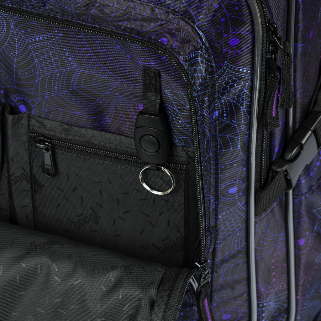 • Přední komora batohu obsahuje praktický organizér a také poutko s karabinou na zavěšení klíčů. Tuto karabinu je možné odepnout a používat samostatně.