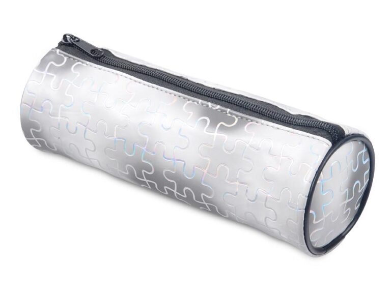 školní penál/etue válcového tvaru v bílé barvě s černými okraji a zipem, přičemž povrch