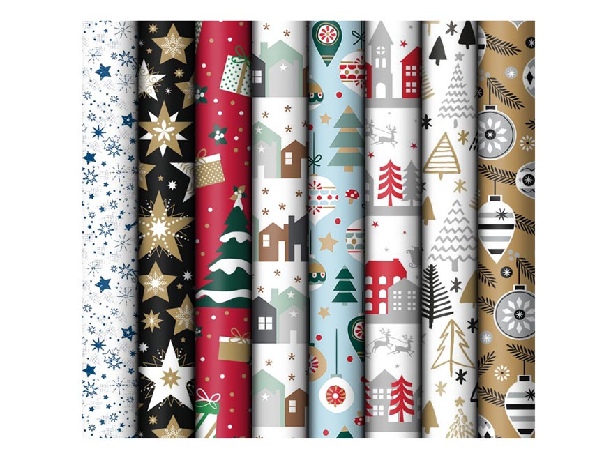 Na výběr je z 8 vzorů – od jemných vloček a zářivých hvězd po hravé stromečky, dárky a zimní domečky. Každý motiv má svůj osobitý šarm, ale všechny spojuje tradiční sváteční nálada v barvách červené, zlaté, bílé, modré a černé.