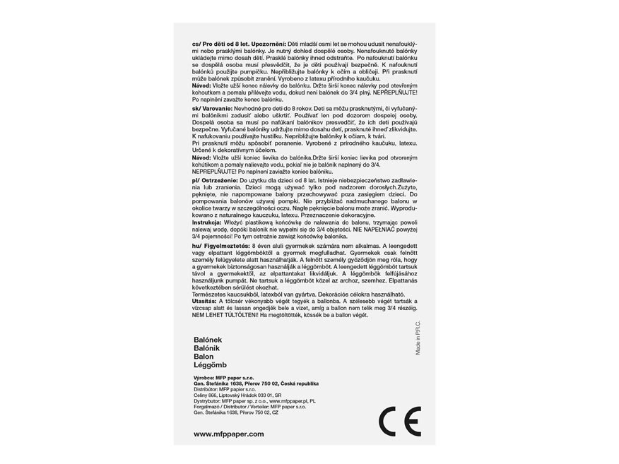 Varování: Pro děti od 8 let. Děti mladší 8 let se mohou udusit nenafouklými nebo prasklými balónky. Je nutný dohled dospělé osoby. Nenafouknuté balónky ukládejte mimo dosah dětí. Prasklé balónky ihned odstraňte. Plastový obal odstraňte z dosahu dětí, hrozí nebezpečí udušení.