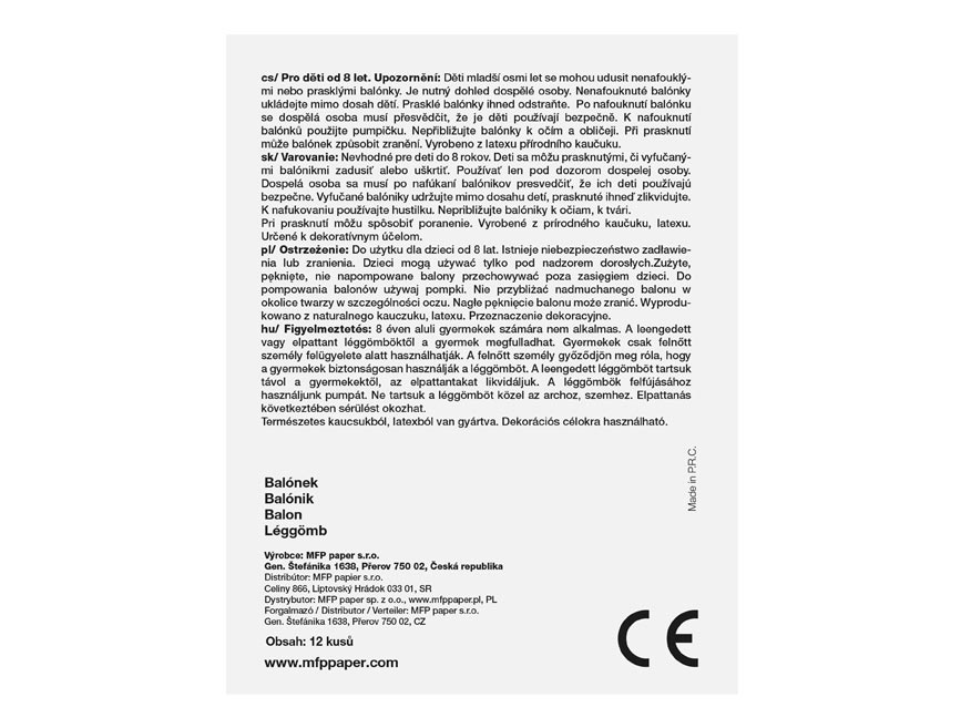 Varování: Pro děti od 8 let. Děti mladší 8 let se mohou udusit nenafouklými nebo prasklými balónky. Je nutný dohled dospělé osoby. Nenafouknuté balónky ukládejte mimo dosah dětí. Prasklé balónky ihned odstraňte. Po nafouknutí balónku se dospělá osoba musí přesvědčit, že je děti používají bezpečně. K nafouknutí balónků použijte pumpičku. Nepřibližujte balónky k očím a obličeji. Při prasknutí může balónek způsobit zranění. Plastový obal odstraňte z dosahu dětí, hrozí nebezpečí udušení.