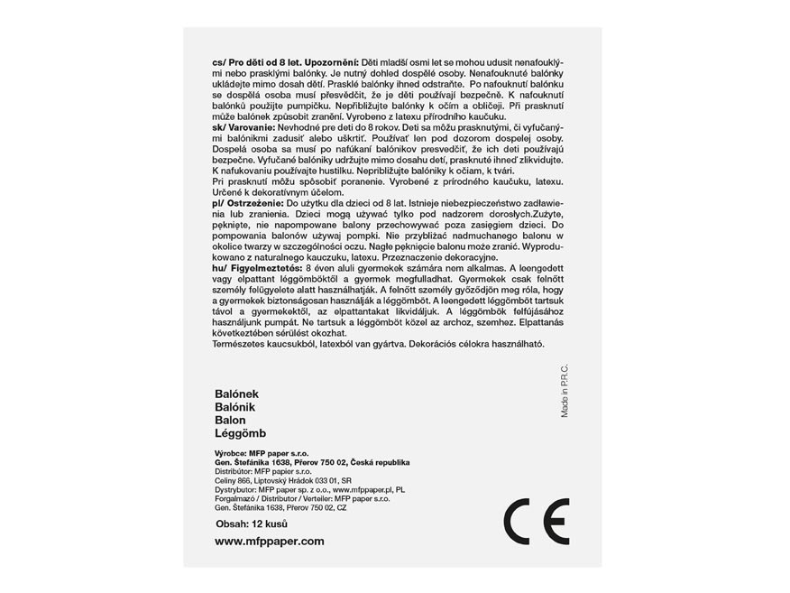Varování: Pro děti od 8 let. Děti mladší 8 let se mohou udusit nenafouklými nebo prasklými balónky. Je nutný dohled dospělé osoby. Nenafouknuté balónky ukládejte mimo dosah dětí. Prasklé balónky ihned odstraňte. Po nafouknutí balónku se dospělá osoba musí přesvědčit, že je děti používají bezpečně. K nafouknutí balónků použijte pumpičku. Nepřibližujte balónky k očím a obličeji. Při prasknutí může balónek způsobit zranění. Plastový obal odstraňte z dosahu dětí, hrozí nebezpečí udušení.